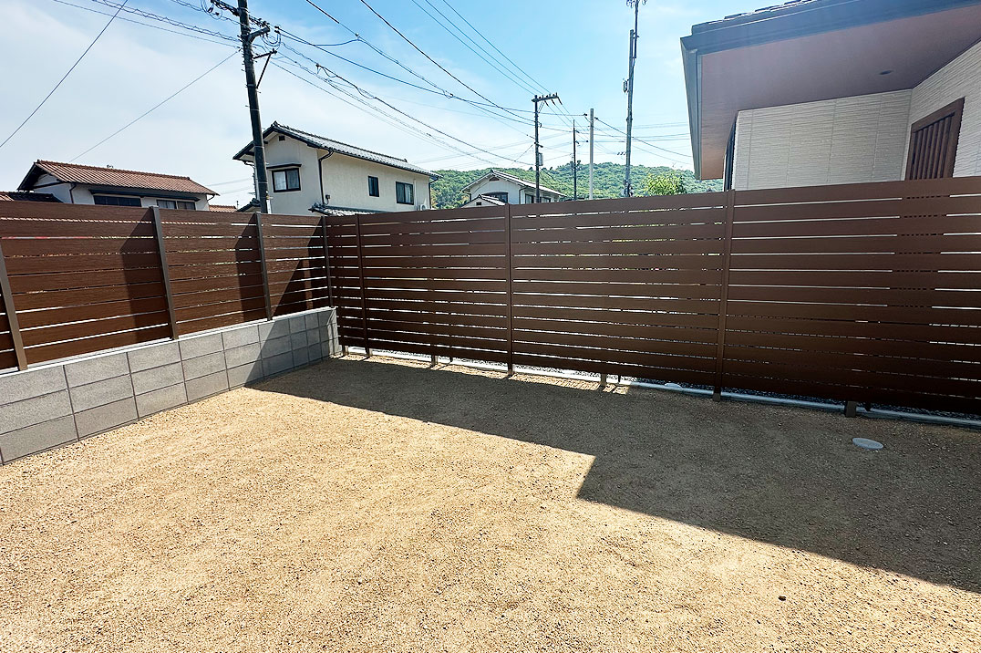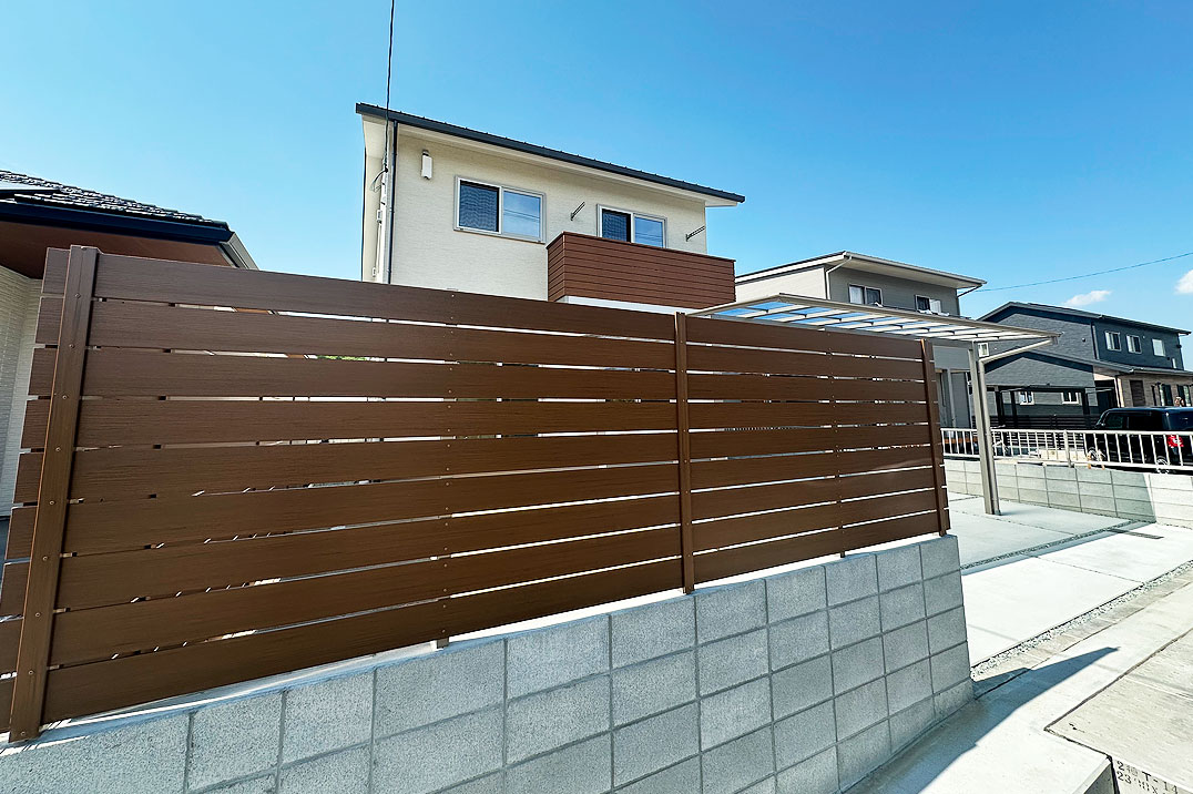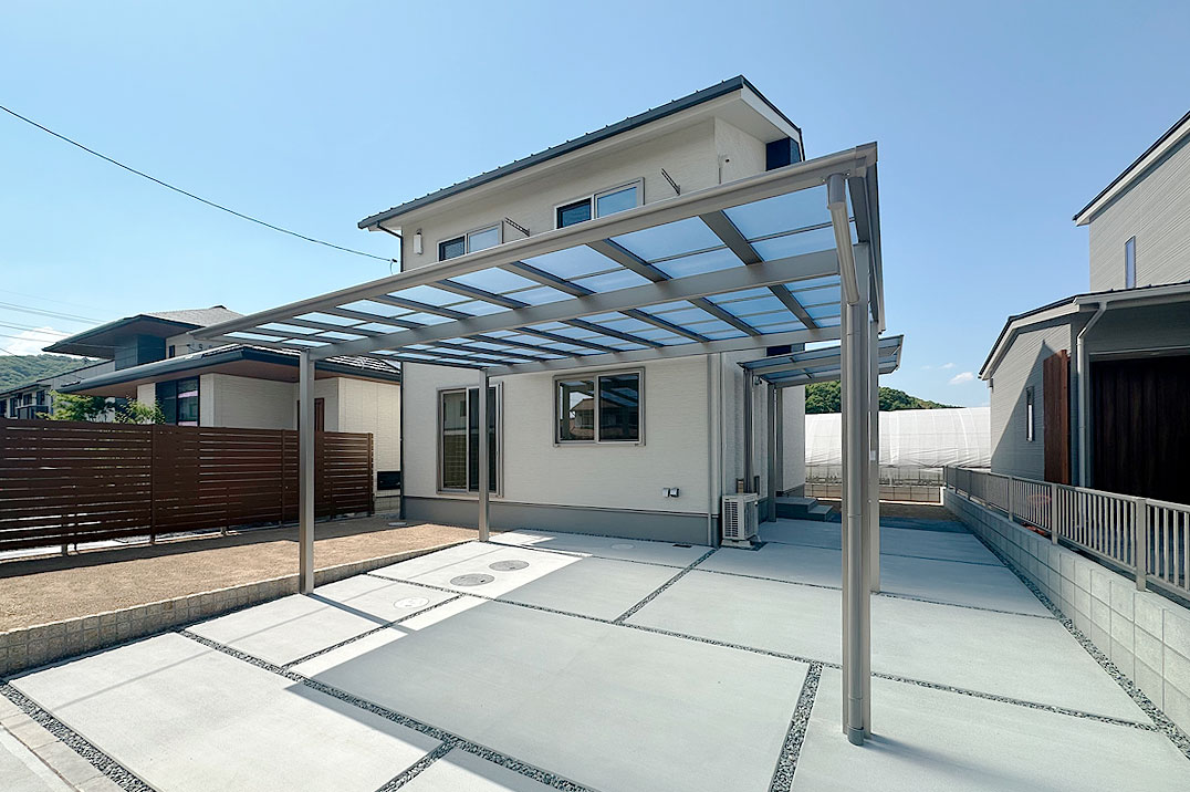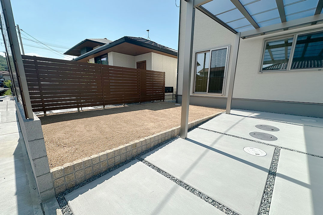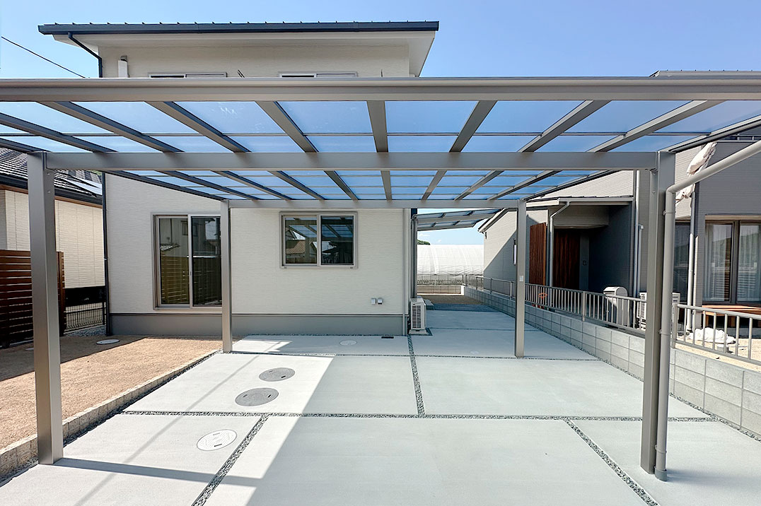 クリーム色の外観にシルバーのカーポートを合わせたスッキリとしたシンプルなデザインの外構です。広々としたお庭部分は、目隠しフェンスでしっかりと視線を遮り、プライベート空間を確保しています。