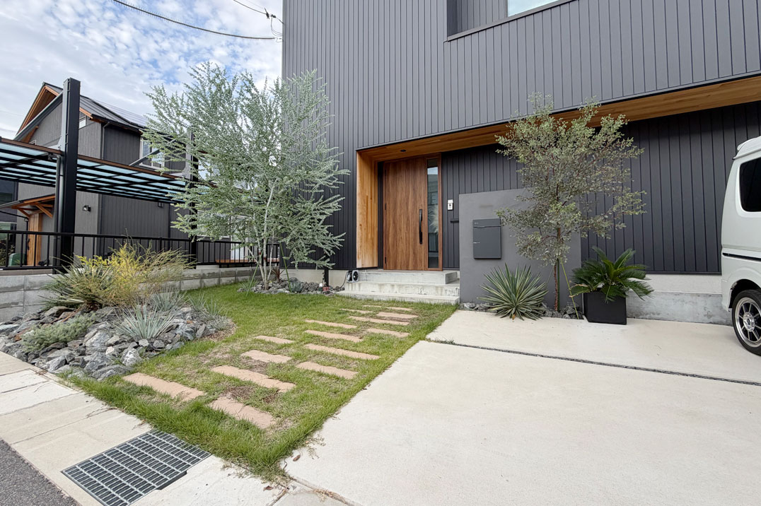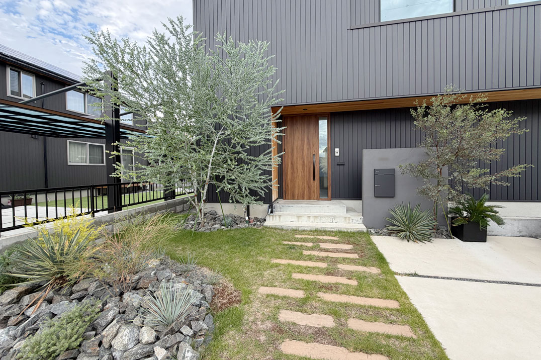 落ち着いた外観に調和する、ナチュラルモダンな外構デザイン。シンプルな素材の組み合わせに、植栽の柔らかさをプラスすることで、建物の上質さをより引き立ててくれます。程よく抜け感を持たせたアプローチが毎日の帰宅時間を心地よく演出します。