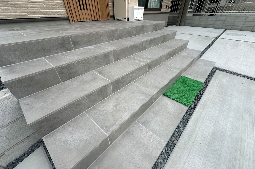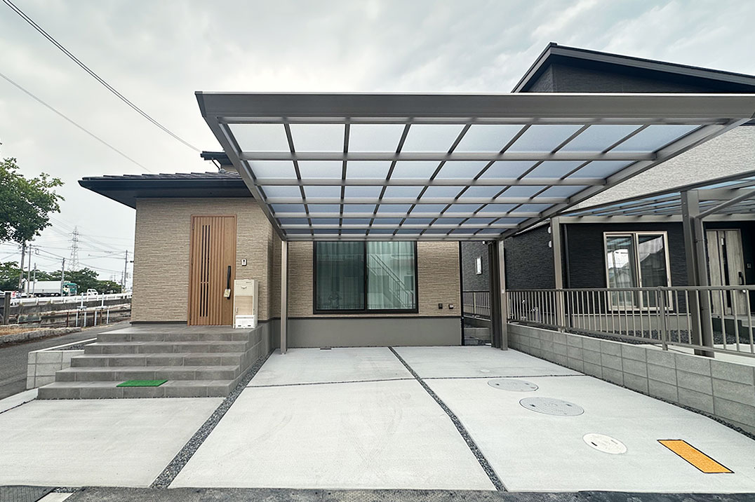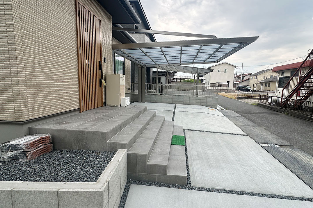 後方支持タイプのカーポート。側面に柱がないことで車のドアに干渉せず、駐車スペースを広く使えます。 玄関ポーチも階段を追加し、出入りのしやすいお庭になりました。